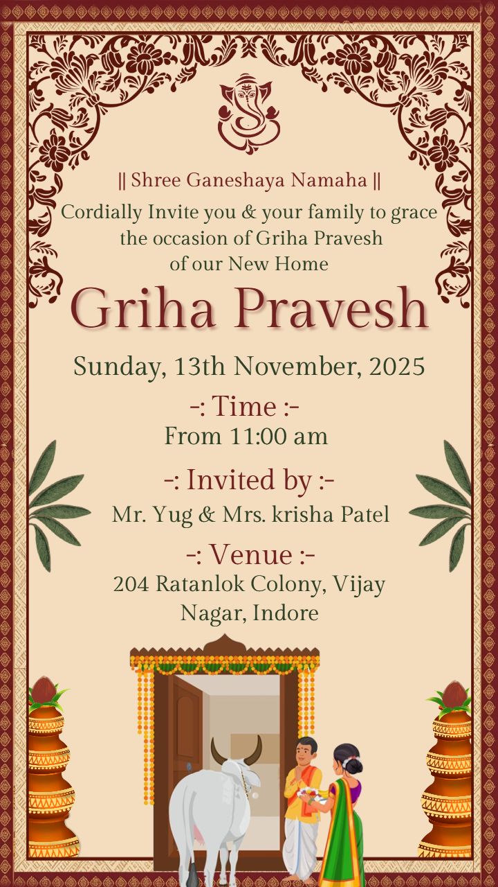 A Griha Pravesh invitation is not just an announcement its a heartfelt message inviting your loved ones to witness a new beginning. It brings together tradition and modern communication.